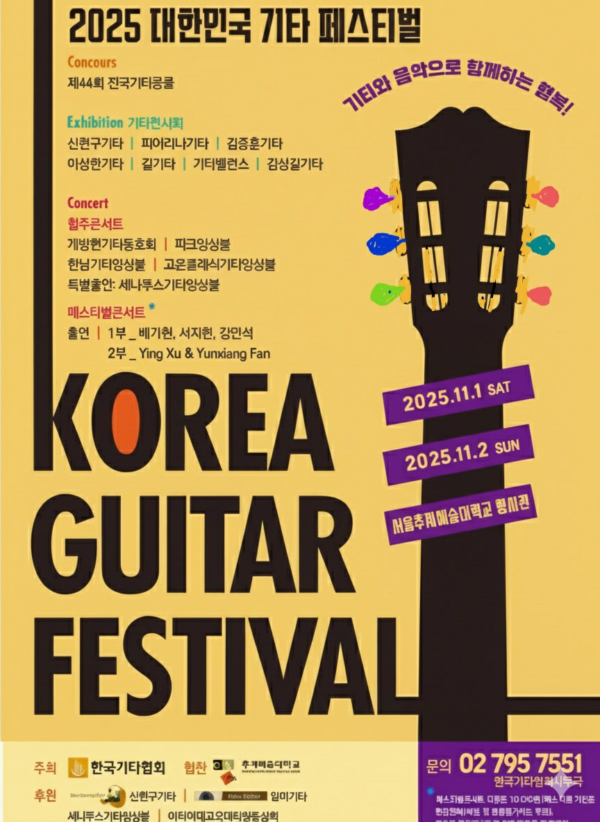 Notice+2025 대한민국 기타페스티벌<콩쿠르 지정곡 반드시 악보확인>(9/29까지)기타애호가앙상블 연주팀 모집안내한국기타협회 2025년도 후원자 모집안내수원대학교 제 26회 전국음악콩쿠르_8월 30일(토) License+2025년 지도자인증 보수교육 실시 안내 _11.9(일)2025년 1급 기타지도자 자격증 응시생 모집 공고 25.10...2025년 서초지부 기타지도자 2급 자격증 응시생 모집 9.20...2025년 대구지회 2급기타지도자 자격증 응시생모집공고 8. 30..2024년 지도자인증 보수교육 실시 안내Free Board+공감토크, 송경수 선생의 기타인생 이야기편 (유투브 고청사랑방 방..2025. 7. 18(금) 기타리스트 변보경 마스터 클래스 (애호..기타오케스트라 단장 리여석_ 여섯 줄의 울림에서 찾은 아름다움공연예술전문지 [객석] _2024년 8월호_ 세계 무대속 한국의 ..2024. 6. 23(일) 기타리스트 변보경 마스터클래스 (애호가..Concert+10.18 오후 2시 김경태이사와 바이올리니스트 시명운의 콘서트 10.18 오후6시 클래식재즈앙상블 Voz "영화속을 넘다2025. 10.21. (화) 오후 7시30분 서울기타콰르텟 해피..2025.10.17(금) 오후 7시 고은클래식기타 제1회정기연주회..2025. 10. 12(일) 오후 6시 기타트리오 아르모니에 콘서.. Musician기타리스트 변보경기타리스트 임재민기타리스트 김정열기타리스트 허원경기타리스트 한은기타리스트 김경태기타리스트 조대연기타리스트 윤원준기타리스트 허유림기타리스트 황보예기타리스트 김한나기타리스트 김유진 Musician Team기타트리오 아르모니아기타 듀오 "보티 (Botti) "다온기타듀오폴리포니기타듀오 Ensemble Team리여석 기타오케스트라서초기타오케스트라수원기타오케스트라부산페스티발기타앙상블빛과 여성 기타합주단세나투스 기타앙상블 Sponsor